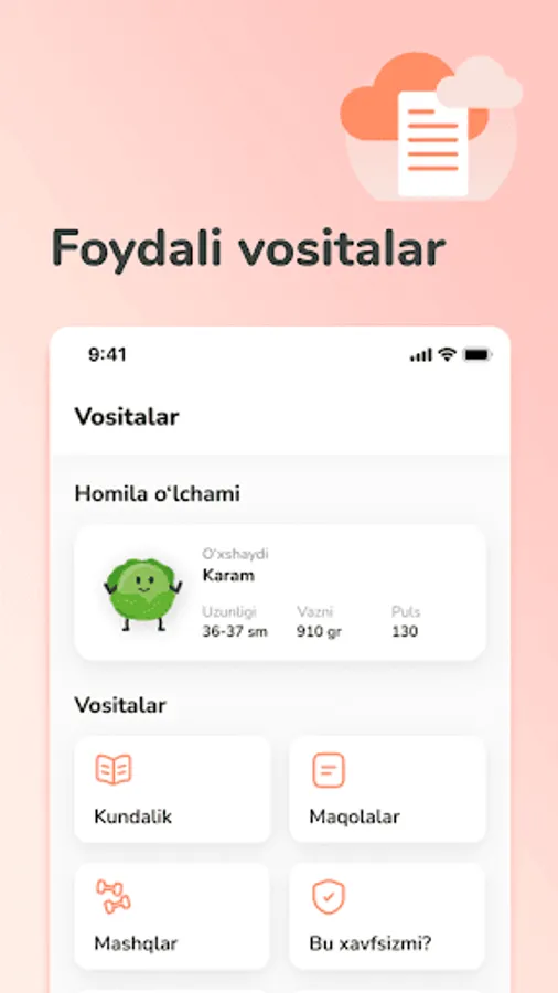 Yangilangan mobil ilovamiz sizga butun homiladorlik davri hamda bola parvarishlash jarayonida asqatadigan quyidagi funksiyalarni taqdim etadi: