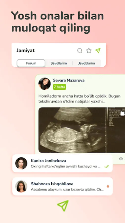 Lalu hamjamiyati - Boshqa homilador ayollar va yosh onalar bilan fikr va tajriba almashish uchun ilovamizdan foydalaning.