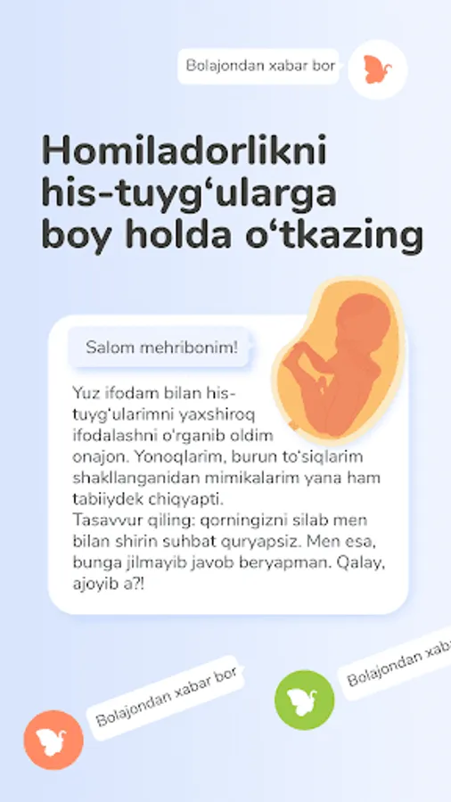 Homiladorlik kalendari - 42 hafta davomida homilangizdagi va sizdagi o‘zgarishlar, homiladorlikda to‘g‘ri ovqatlanish, ginekolog maslahatlari, muddatingizga mos ravishda tavsiya qilingan tibbiy tekshiruv rejalari haqida maʼlumotlar;