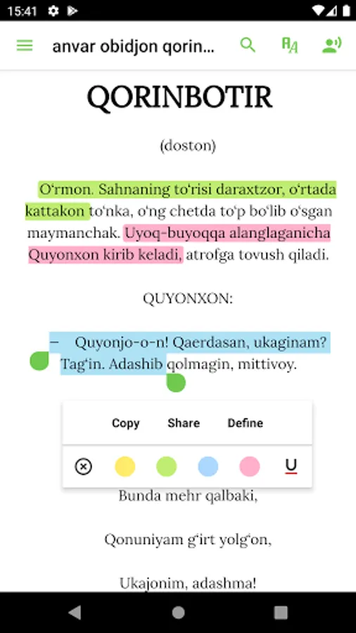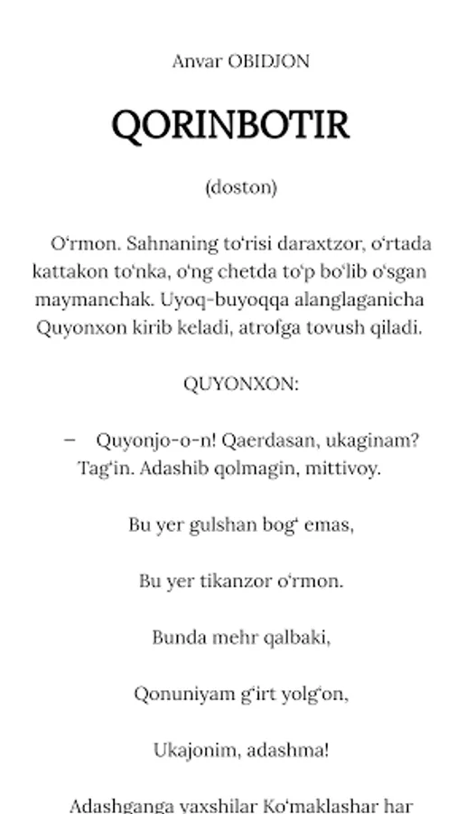 Qadimdan hayvonlar obrazi ifodalangan asarlar juda mashxur. O'rmonda yashovchi Quyon, sher, ayiq, bo'ri, tulki, panda kabi hayvonlar endi Anvar Obidjon qalamiga mansub "Qorinbotir" asarida bir joyda jamul jam. Erk va adolat kabi so'zlar bilan bezalgan ushbu o'rmondagi qiziq voqealar tinchlik so'zini yana bir bor yodga soladi. Har tarafdan keluvchi Ovoz qahramonlarimizga yovuzlikdek tuyiladi. Va ularga bu ovozni yo'qotish jahonga rostgo'y, vaqtni, vatanni qadriga yetish, mard jasur hayvonlarga aylanish asosiy vazifaga aylanadi. Mustaqillikni ular qarshilay oladimi degan savol ham bor. Bunga kitobni o'qib javob oling.