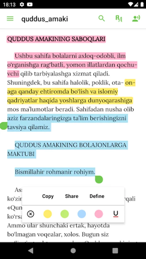 Tushunmay qolgan joylaringizni kattalardan so'rab oling. O'qiganlaringizning man'nosini anglab, eslab qolishga harakat qiling! O'zingiz to'la tanishib chiqqandan so'ng kitobchani aka-ukalaringizga, opa-singillaringizga, do'st va qarindoshlaringizga ham o'qigani berib turing! Shunday qilsangiz, savobga (Xudoning mukofotiga) sazovor bo'lasiz, xo'pmi?