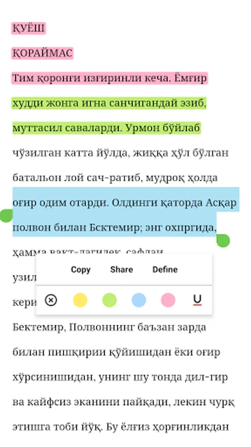 Tim qorong'i izg'irinli kecha. Yomg'ir xuddi jonga igna sanchiganday ezib, muttasil savalardi. Urmon bo'ylab cho'zilgan katta yo'lda, jiqqa ho'l bo'lgan batal'on loy sach-ratib, mudroq holda og'ir odim otardi. Oldingi qatorda Asqar polvon bilan Bektemir; eng oxprgida, hamma vaqt-dagidek, safdai uzilmaslikka tirishib, chatanog'ini kerib, Ali tajang sudralardi.