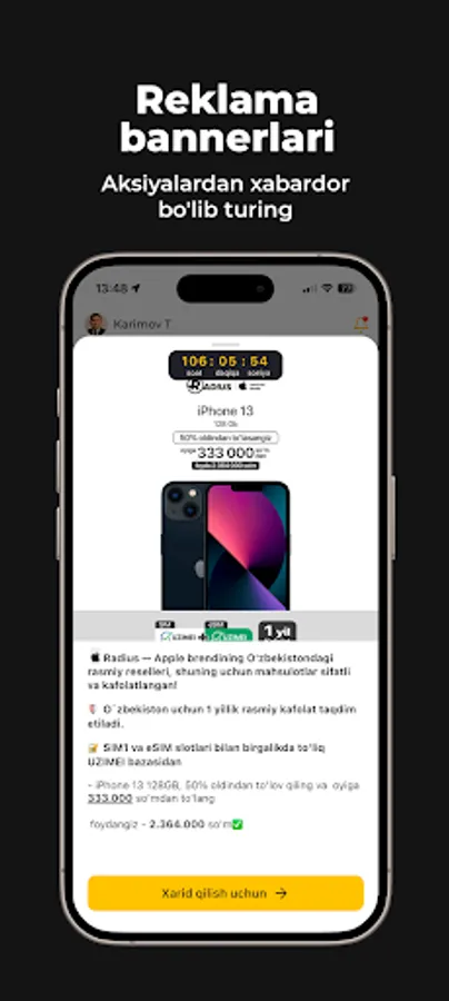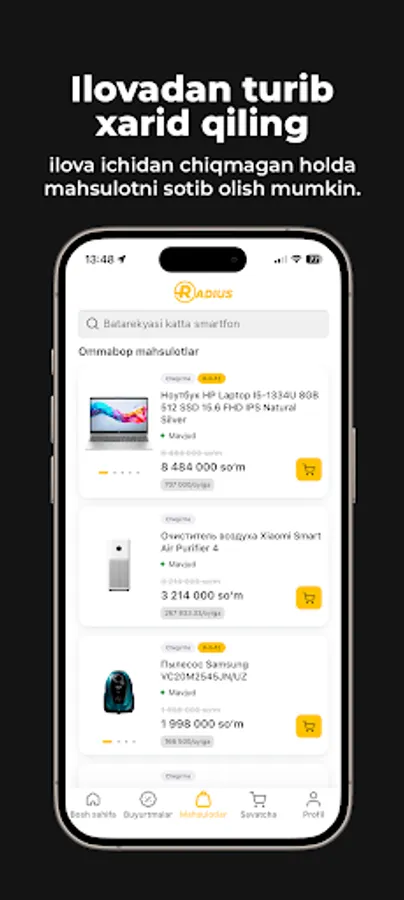 Radius Nasiya muddatli to‘lovi orqali xaridlarni oflayn va onlayn tarzda smartfonlar, maishiy texnikar, noutbuk va TV lar xarid qilishingiz mumkin.