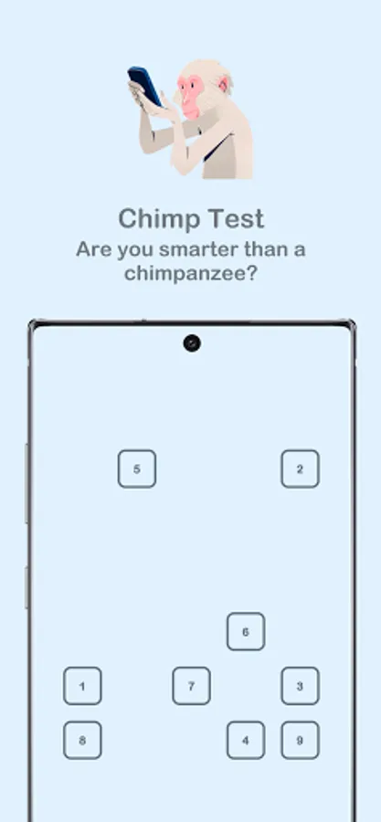 - Chimp test: You will be shown and then hidden random squares with numbers, and the task is to select each square's increasing order. This test has been conducted on chimps and on average they score 9. Can you beat them?