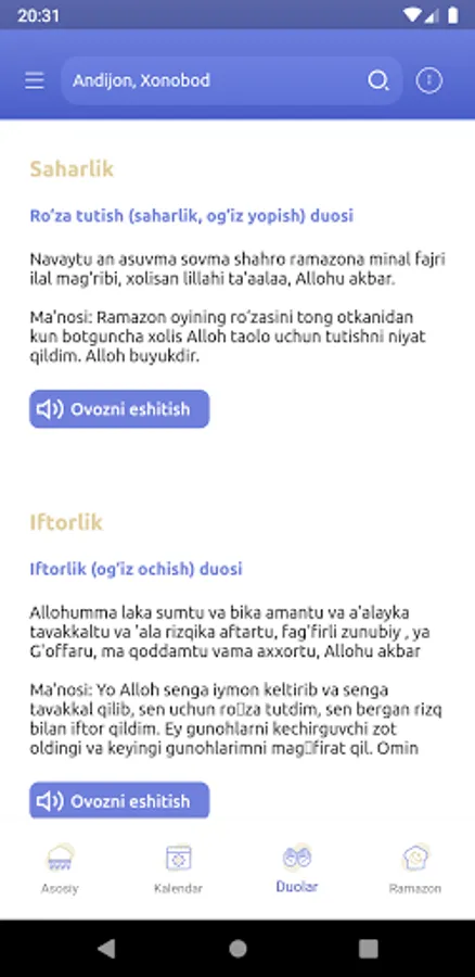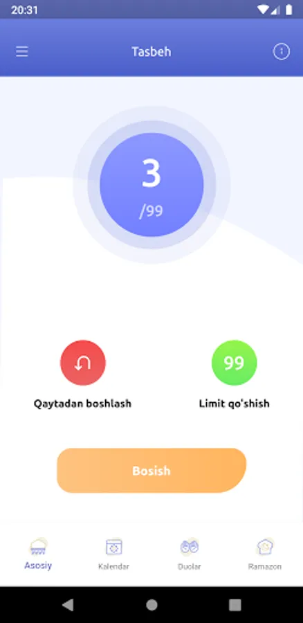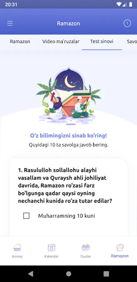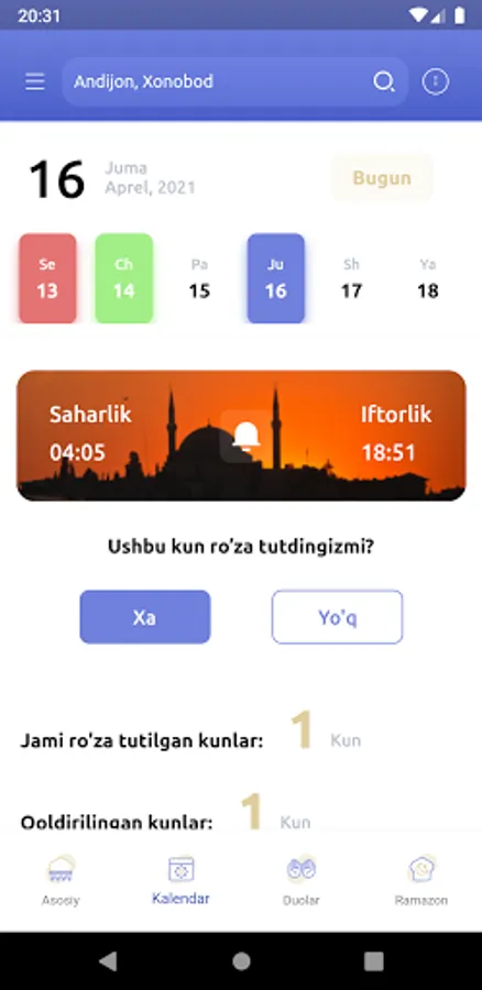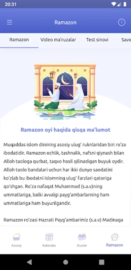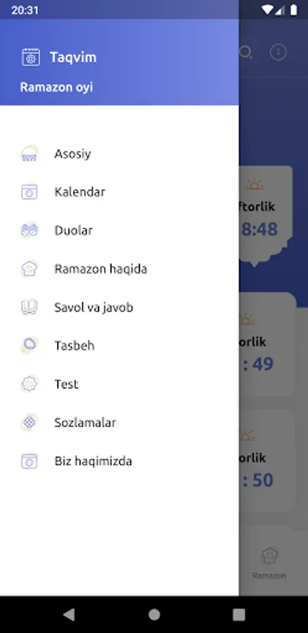 Ramazon taqvim mobil ilovasi “Eurosoft” korxonasi tomonidan ishlab chiqarilgan. Bu mobil ilovada nafaqat ramazon taqvimi, balki ko'plab imkoniyatlarni o'z ichiga oladi. Siz ilova yordamida ro'za tutgan va tutmagan kunlaringizni sarhisob qilishingiz mumkin. Dastur yordamida siz diniy bilimlaringizni mustahkamlab olishingiz uchun “Savol va Javob”, “Test”, “Ramazon” bo'limlari mavjud. Ilovada “Tasbeh” bo'limi mavjud bo'lib bu orqali zikrlaringizni hisoblashingiz mumkin.