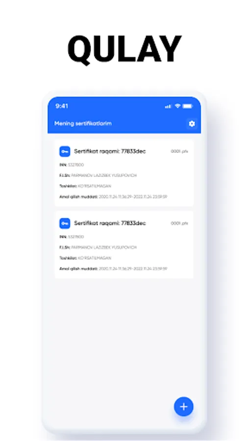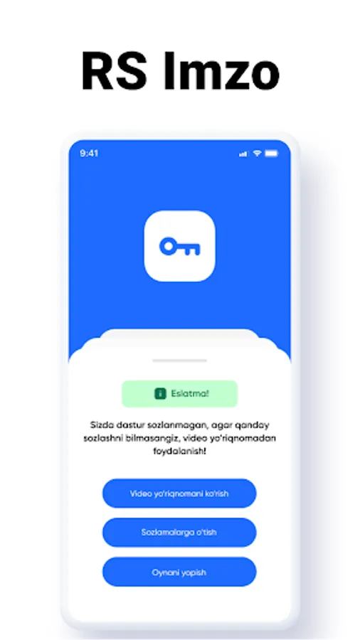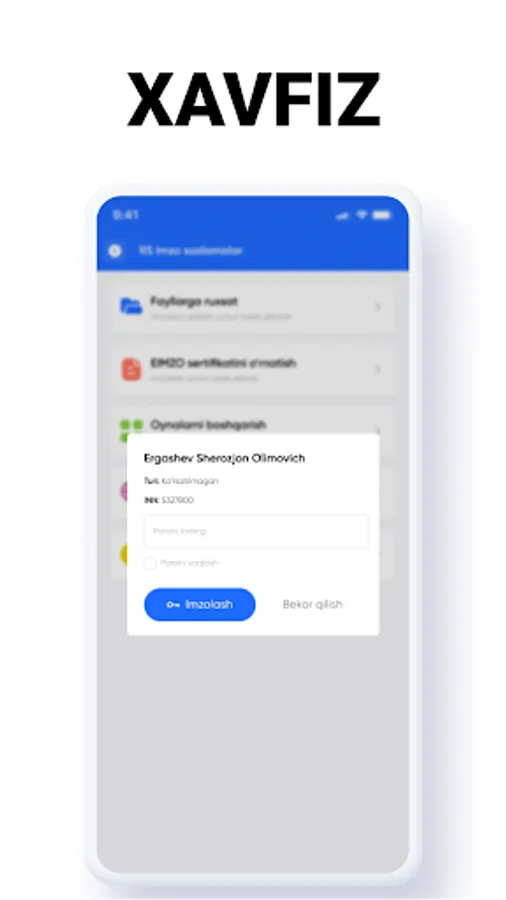 RS Imzo is designed for quick and convenient signing of electronic documents with electronic keys issued by the SIC NT of the State Tax Committee of the Republic of Uzbekistan. An electronic document for signature is generated by another application or on the site in the form of a QR code and transferred to the RS Imzo mobile application for selecting an EDS key and signing.