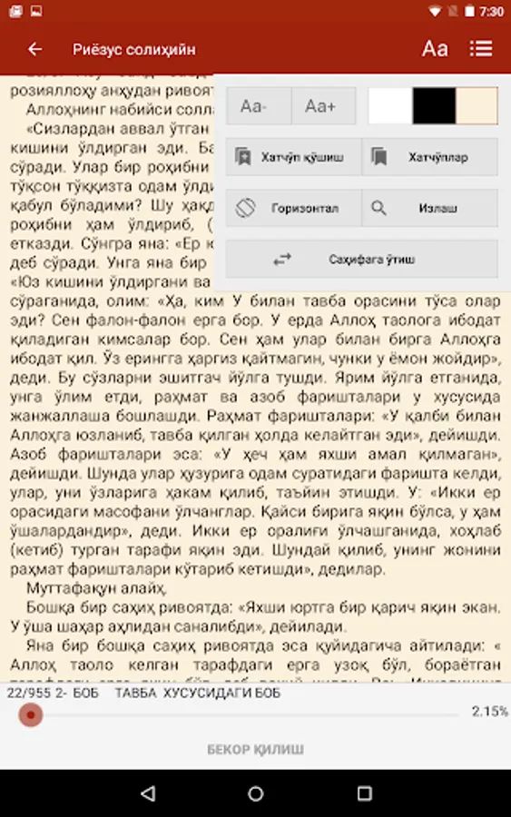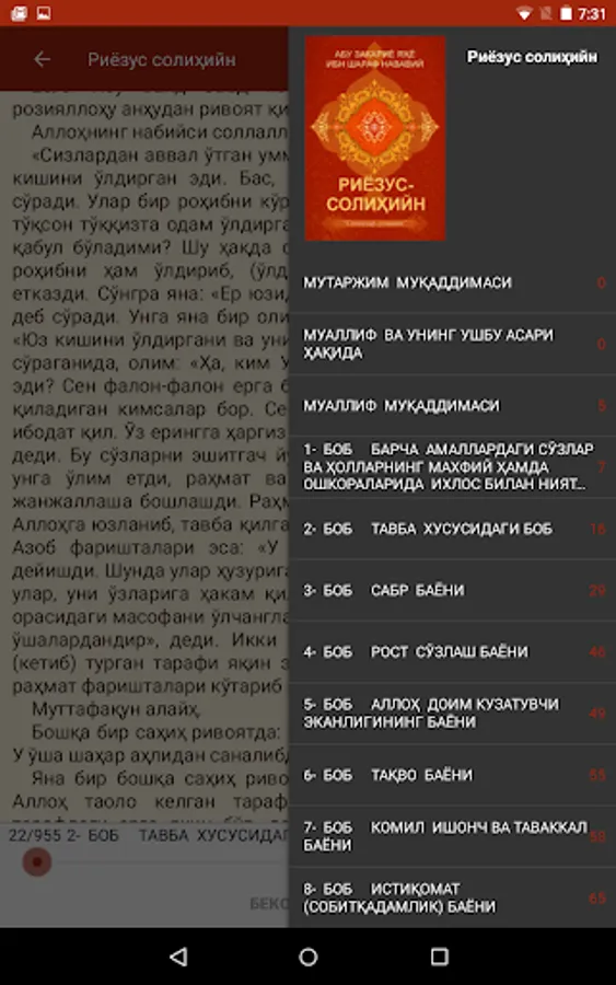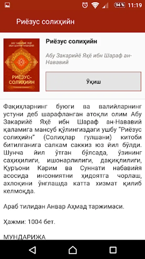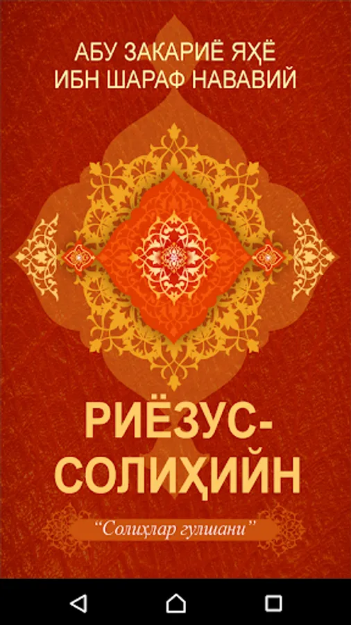 Faқılarning buyugi wa valilining ustuni deb sharaflangan atolim olim Abu Zakariye Yayo ibn Sharaf an-Navaviy Kalamiga mansub қўlingizdagi usbu “Riyezus solҳiyin” (Solylar gulshani) kitobi bitilganiz yalzak sakki. Shuncha yil ганtgan bўlsada, иниzing of saҳiҳiligi, ishonarligi, daқiқliligi, Қuroni Karim wa Sunnati nabaviyya asosida insonyatni ҳ idoyatga лаorlash, achloқini ўnglashda katta hizmat қilib.