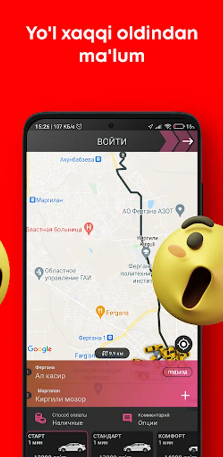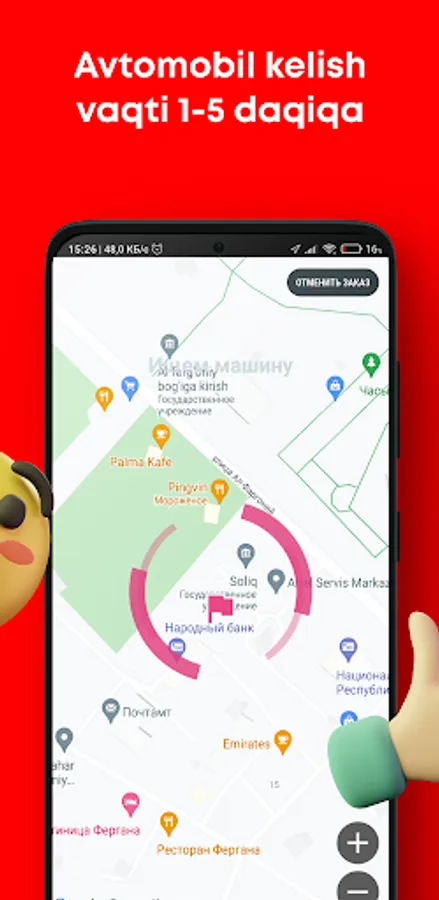 Manzilingizni ko'rsatib bir necha tugmachalarni bosish orqali taksi chaqirishingiz va boshqa qo'shimcha xizmatlardan foydalanishingiz mumkin.