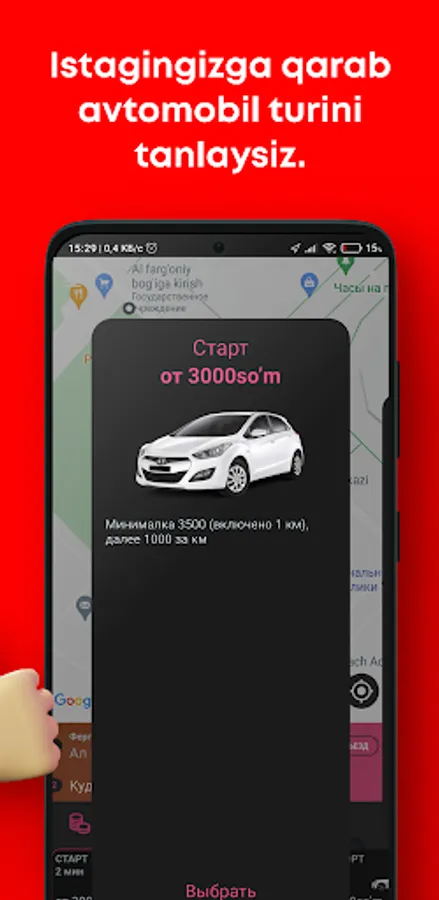 Istagingizga qarab avtomobil turini yoki xizmatni tanlaysiz.