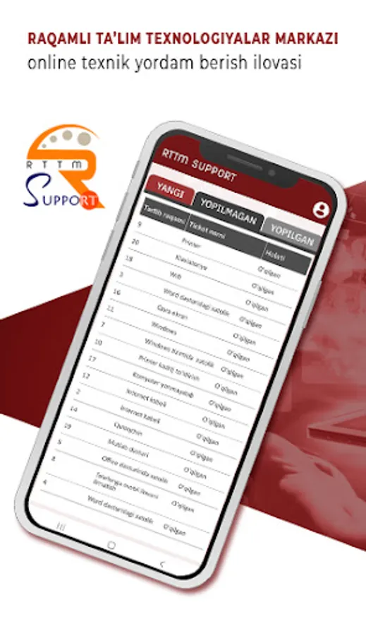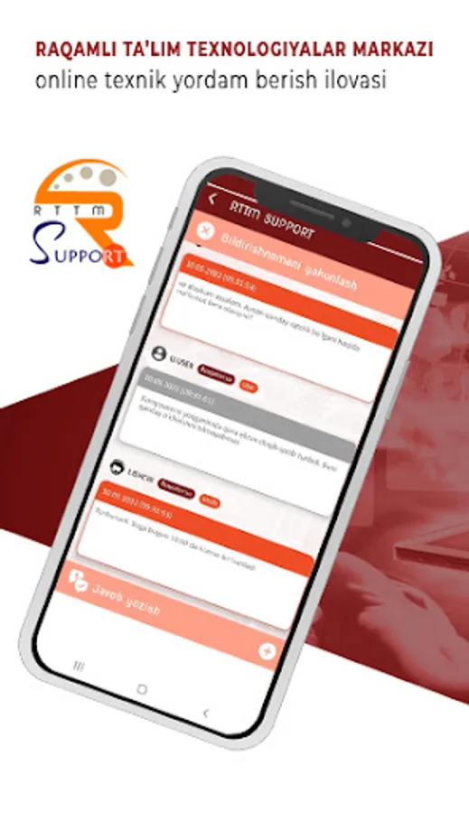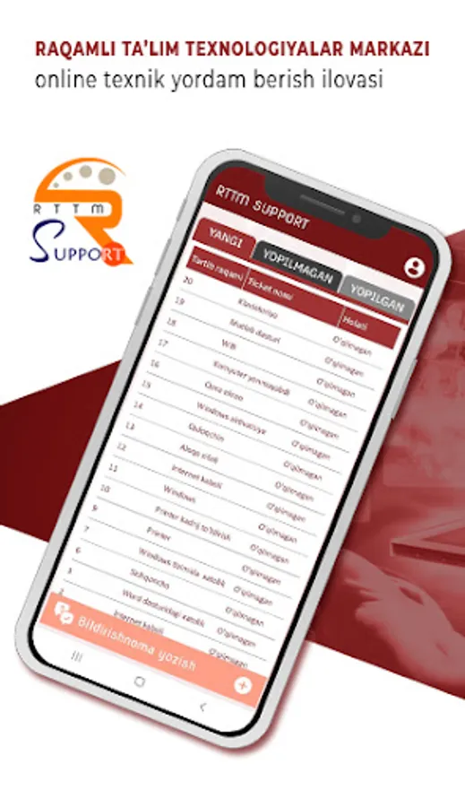RTTM Support mobil ilovasi orqali O'zbekiston Milliy Universiteti Jizzax filiali xodimlarida mavjud texnik muammolar yuzasidan Raqamli Ta'lim Texnologiyalar Markaziga bildirishnomalarni online yozishlari mumkin.