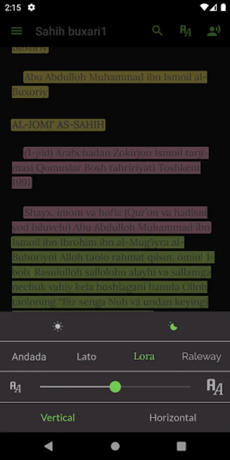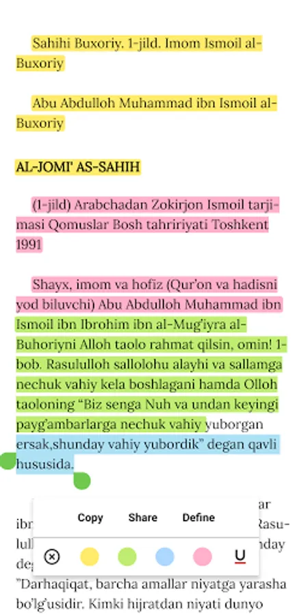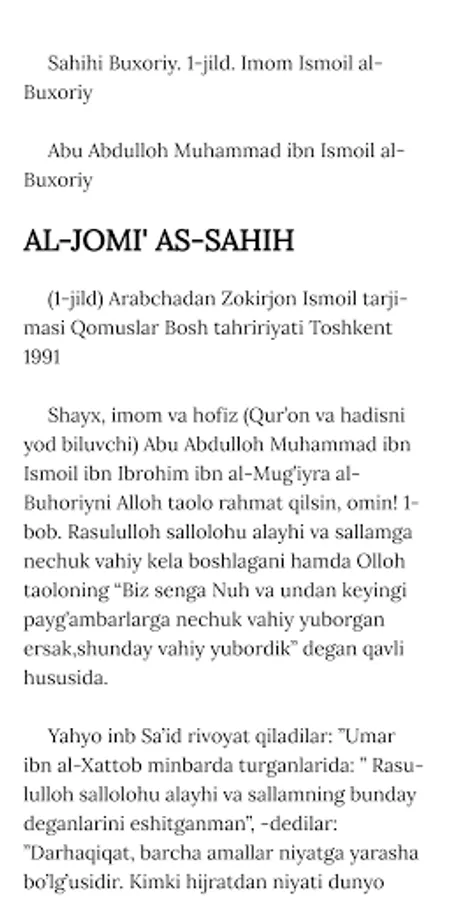 Assalomu Alaykum aziz dindoshim. Ushbu Buxoriyning hadis kitobi haqiqiy sahih xadislar to'plami bo'lib. Ushbu kitobda Imom Al Buxoriyning barcha rivoyat va hadislari o'rin olgan. Ushbu kitob mutaqo o'zbek tilida. Islomiy hadislar olami desak ham bo'laveradi. Ushbu Payg'ambarimiz S.A. V ning barcha hadisi shariflari ushbu kitobda yozilgan. Islom dini naqadar go'zal va betakror. Bu islomiy kitob bir necha asrlardan beri mavjud. Uni o'zbekcha kitob qilishda ko'mak bergan barchadan Alloh rozi bo'sin.