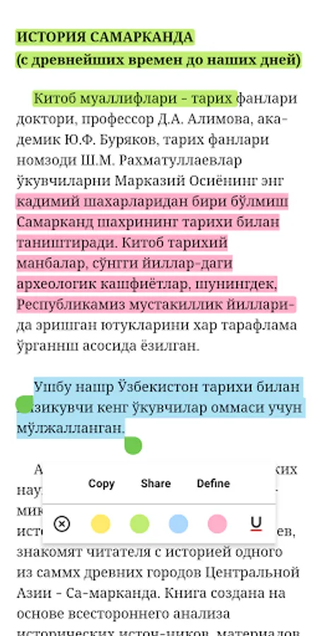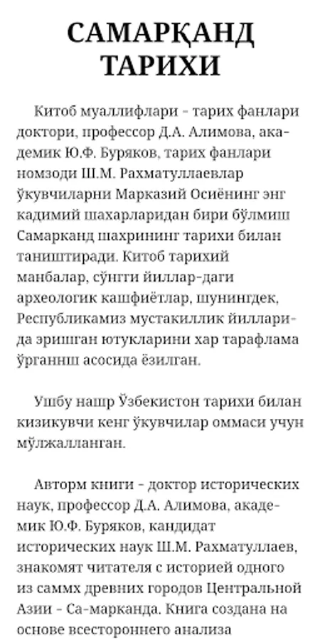 Assalomu aleykum! Aziz dindoshim sizlarga yana bir qiziqarli, foydali ma'noli kitoblarimizdan birini taqdim qilmoqdamiz. Ushbu kitob yurtimizni ko'zga ko'ringan shaharlaridan biri Samarqand tarixini butunlay o'ziga jamlab olgan kitoblardan biri desak xam mubolag'a bo'lmaydi. Bu kitobda shaxrimizning tarixiy, memoriy obidalar, bir biridan go'zal maskanlari keng yoritilb yozilgan. Ushbu kitobni o'qib Samarqand tarixi to'g'risida ozmi ko'pmi ma'lumotga ega bo'lsangiz, bundan biz albatta hursand bo'lamiz.