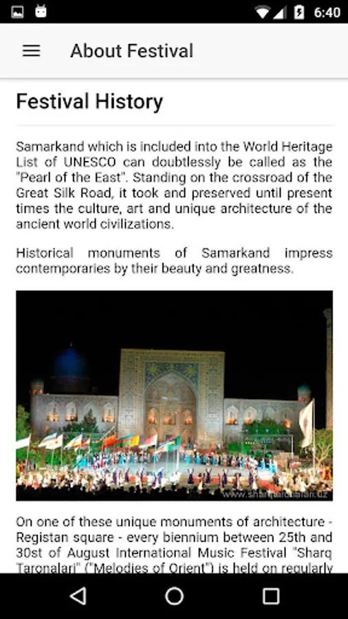 On one of these unique monuments of architecture - Registan square - every biennium between 25th and 30st of August International Music Festival "Sharq Taronalari" ("Melodies of Orient") is held on regularly organized under the patronage of UNESCO.