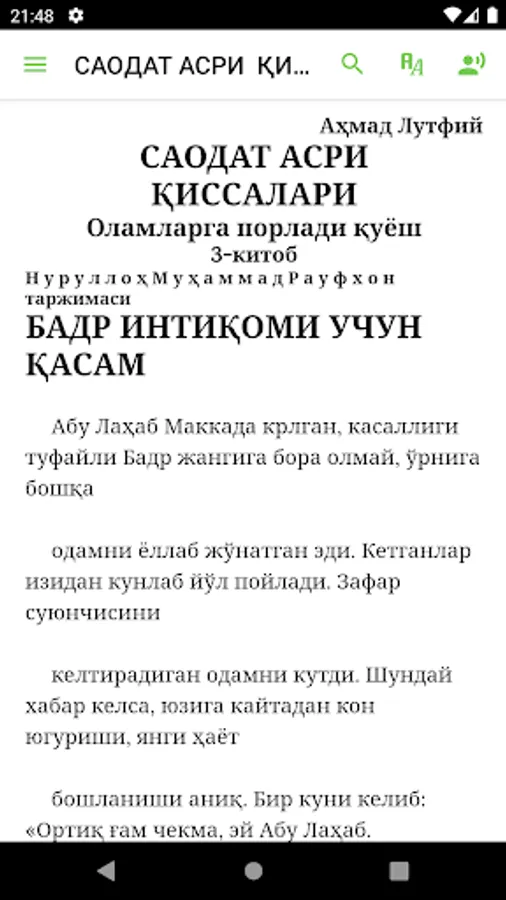 Bu kitob olamlarga rahmat eshigi, sarvari, koinotga o'z yog'dusini olib kelgan nabiyyimiz Muhammad sollalohu alayhi vassallam tug'ilmaslaridan to vafot etganlarigacha payg'ambarlik maqomiga yetganlarigacha hayishi Ushbu kitob Ahmad lutfiyning-Saodat asri kitobi bo'lib bu mutlaqo bepul kitob, siz kitobxonlar uchun tayyorladik sizlarga manzur bo'ladi degan umiddamiz. Bu kitobni o'qib Payg'ambarimiz s.a.v ga bo'lgan muhabbatlaringiz yanada oshadi. Inshaalloh