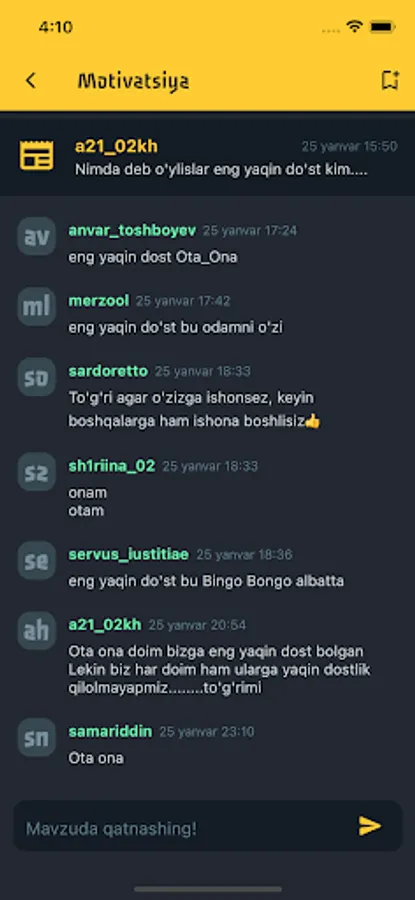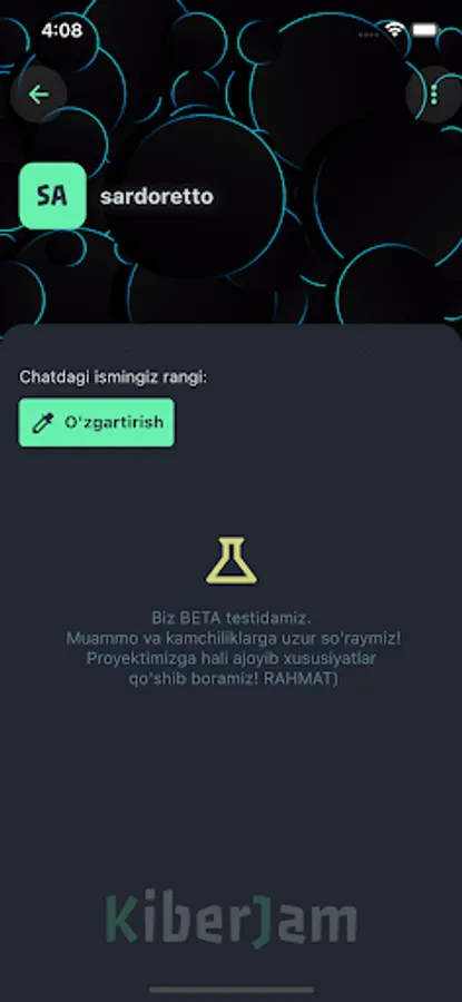 Kiberjam - foydalanuvchilarga turli xil jamoalar ostida bir birlari bilan suhbatlashish imkonini beradigan platforma. Siz ham o'zingizga qiziqarli bo'lgan jamoaga a'zo bo'ling. Va shu jamoa ichida yangi do'stlar orttirib, ular bilan chat orqali suhbatlashing!