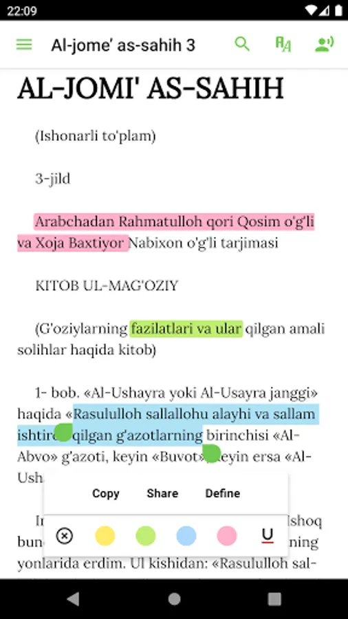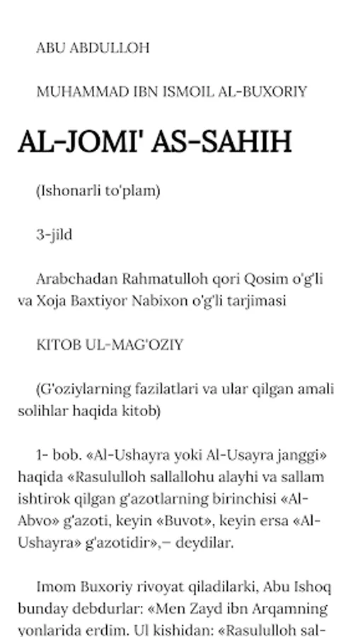 Imom Al-Buxoriyning Al-jome As-sahih Islom dini talimotiga ko'ra quroni karimdan keyingi asosiy manba xisoblanadi. Imom Al-Buxoriyning bu yirik kitobi 600-ming xadisdan saralanib olindi. Ushbu kitob islom olamidagi barcha muxaddislarga namuna bo'ladigon Payg'ambarimiz Alayxissalomning sahih xadislarini o'zida mujasam etgan.