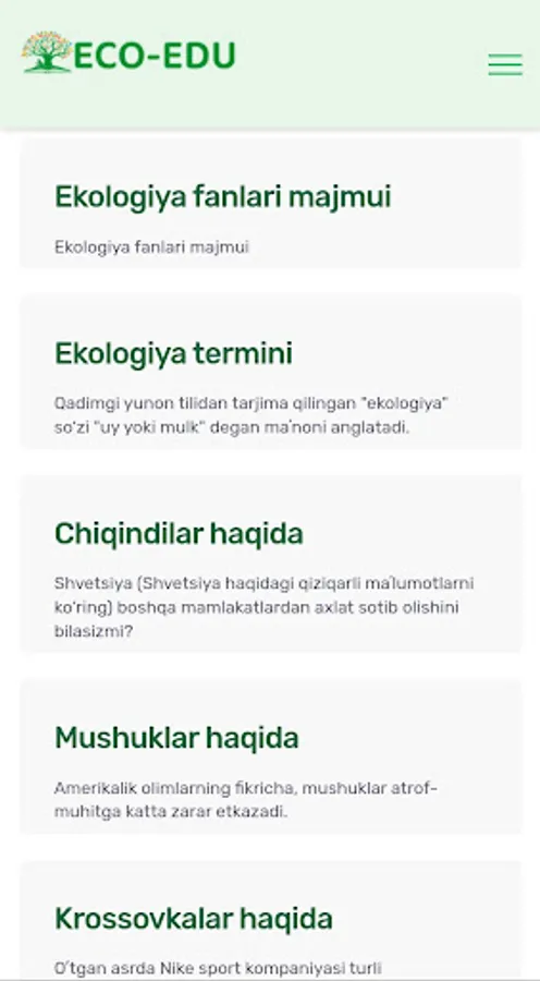 Ekologika ilovasi o'quvchilar, talabalar, o'qituvchilar va ekologiya haqida ko'proq ma'lumot olishga qiziqqan har bir kishi uchun ajoyib manbaadir.