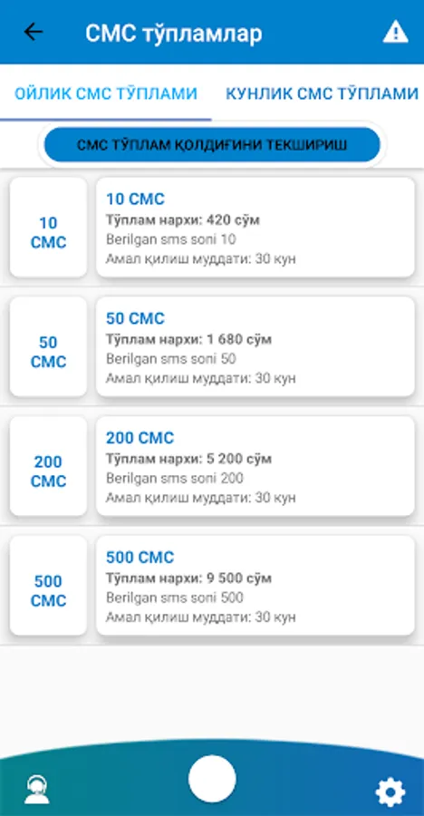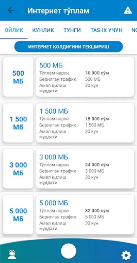 * Internet, sms va ovozli paketlarni faollashtirish,