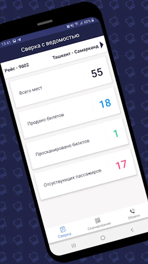 The application for the apron controller Smart Bus Station Uz serves to check-in passengers who have arrived for the flight, by scanning the QR code on the ticket. The application allows you to: