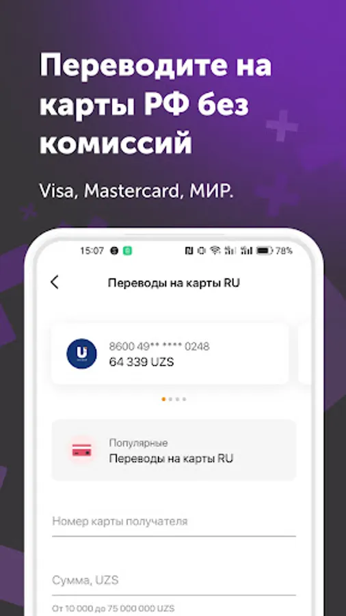 Interest-free transfers with the best conversion rate to Russian cards: MIR, VISA and MasterCard.