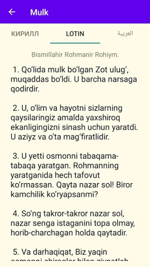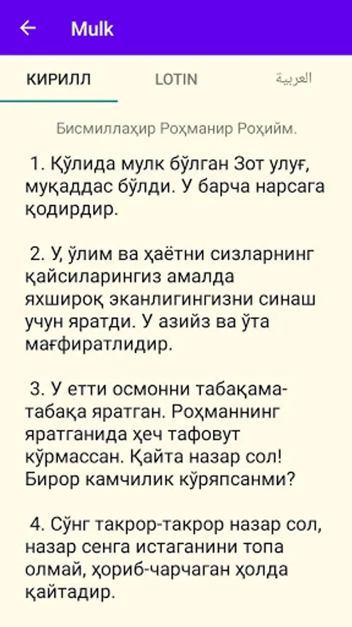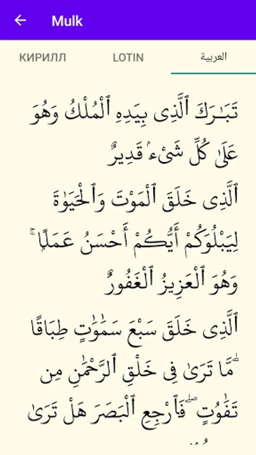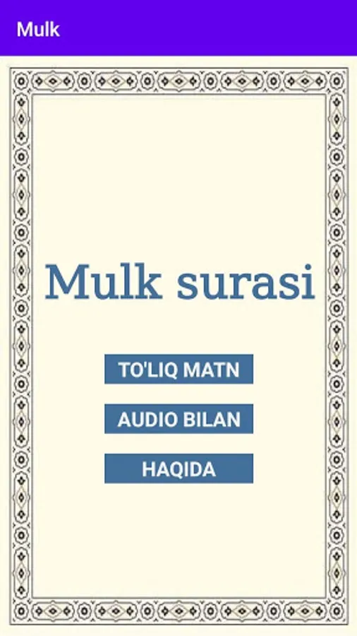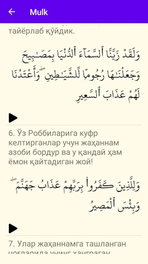 Ushbu ilova orqali mulk surasini o'rganishingiz mumkin, shuningdek, audio tilovatni ham internetsiz eshitishingiz mumkin