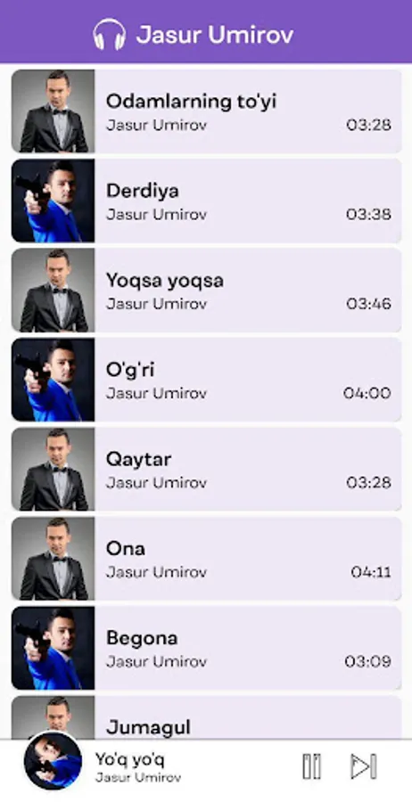 Ilovada O'zbekistonda sevimli xonanda Jasur Umirovning quyidagi qo'shiqlaridan bahramand bo'lishingiz mumkin: