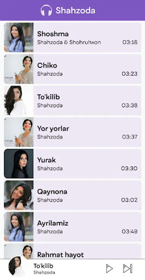Ilovada O'zbekistonda sevimli xonanda Shahzoda ning quyidagi qo'shiqlaridan bahramand bo'lishingiz mumkin: