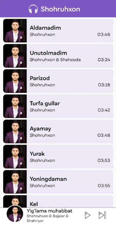 Ilovada O'zbekistonda sevimli xonanda Shohruhxonning quyidagi qo'shiqlaridan bahramand bo'lishingiz mumkin: