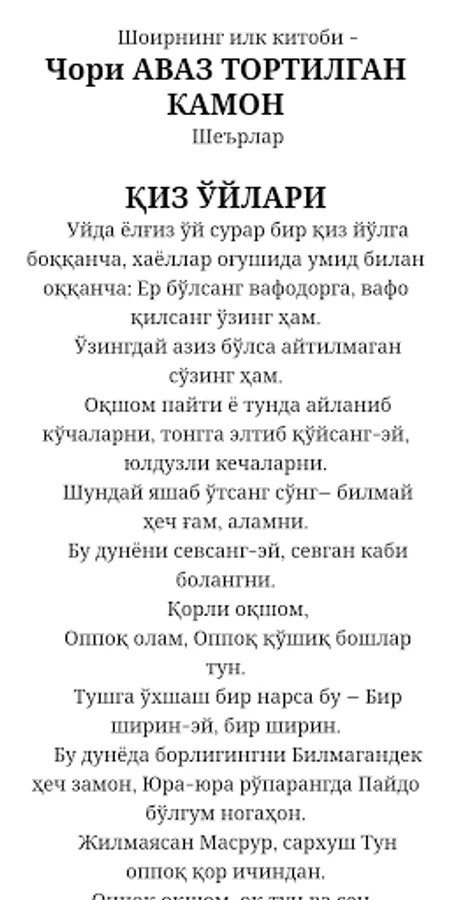 Uyda yolg'iz o'y surar bir qiz yo'lga boqqancha, xayollar og'ushida umid bilan oqqancha: Yer bo'lsang vafodorga, vafo qilsang o'zing ham.