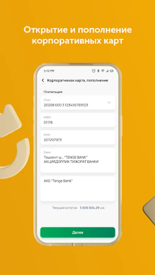• Making Regular payments, payments to the Treasury of the Republic of Uzbekistan, payments to the Budget recipient, payments to replenish the Corporate card, payments to repay a loan from soum accounts.