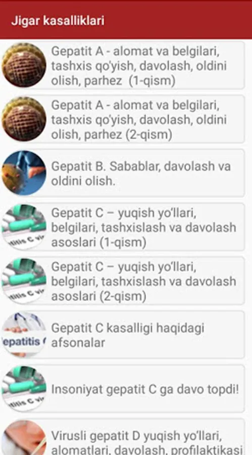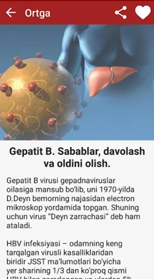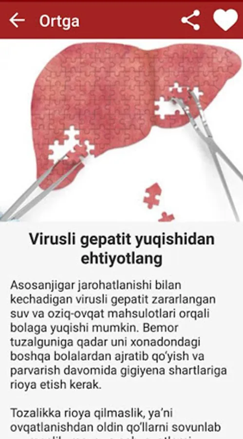 Ushbu ilovada siz jigar kasalliklari haqida mutaxassislar tomonidan taqdim qilingan foydali maqolalar va tavsiyalar bilan tanishishingiz mumkin. Bundan tashqari, jigar kasalliklari profilaktikasi uchun muhim bo'lgan zaruriy tavsiyalar ham keltirib o'tilgan.