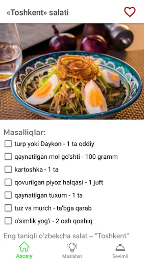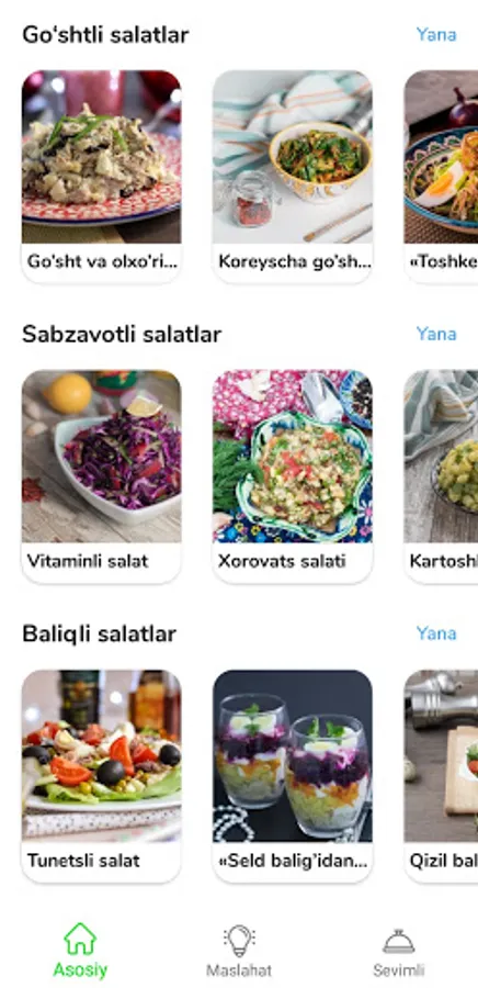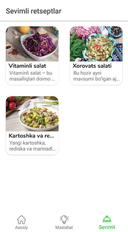 Ushbu dastur o'zbek tilida bo'lib, o'z ichida ko'plab foydali, sara hamda bir-biridan retseptlar jamlangan. Dastur orqali mazali salatlar dunyosiga osonlikcha sayohat qilishingiz, ularni tayyorlash bo'yicha ko'plab ko'rsatmalarga ega bo'lishingiz mumkin.