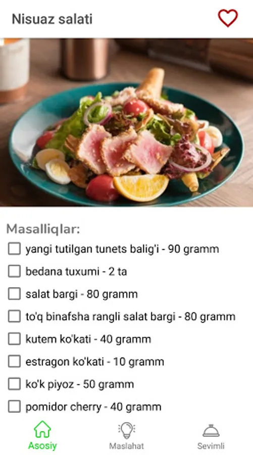 Retseptlar to'plamida har bir salatning tayyorlanishi qadamba-qadam yoritilgan. Salatlar tayyorlash uchun zarur bo'lgan masalliqlar to'plami ham foydalanish uchun qulay tarzda taqdim etilgan bo'lib, ularni tayyorlash jarayonidayoq o'zingiz uchun belgilab borishingiz mumkin.