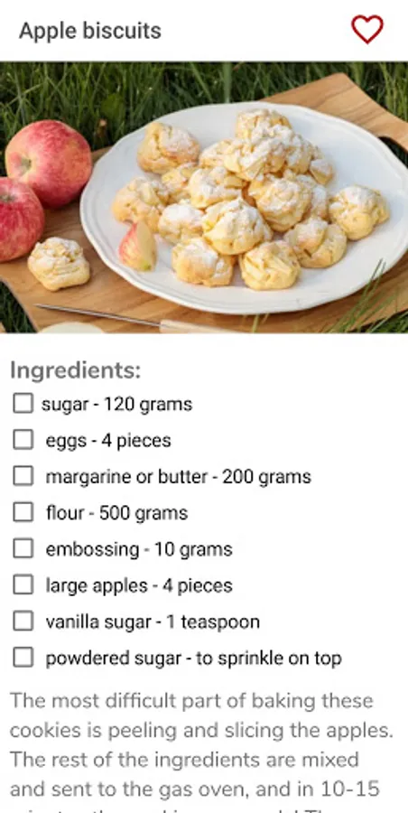 With sections like cakes, pies, muffins, cookies, you can easily find and sort your favorite dessert, baking recipe. In addition, the recipes describe the preparation of each cake step by step. The set of ingredients for desserts and baked goods is also easy to use, you can choose them for yourself during the preparation process.
