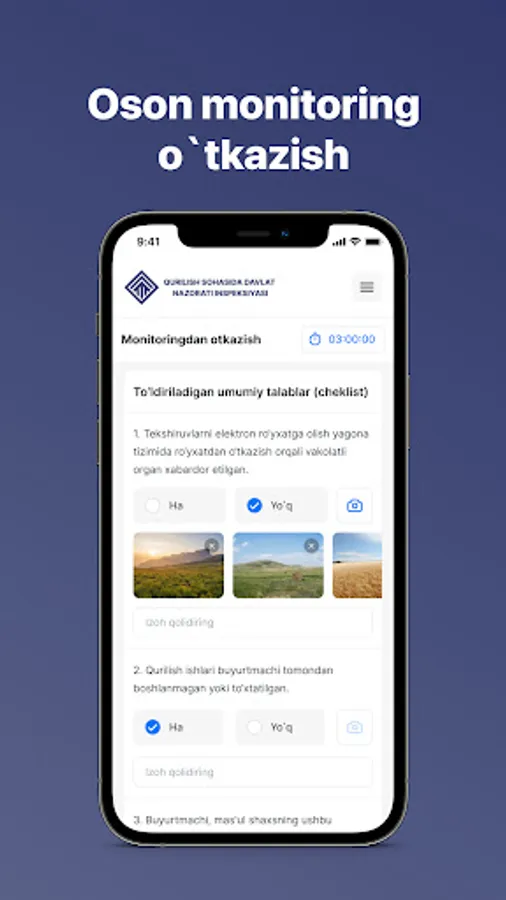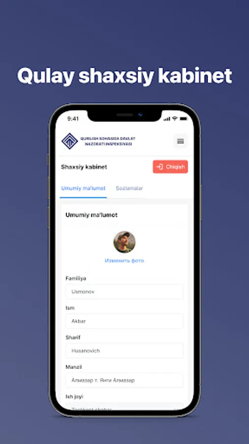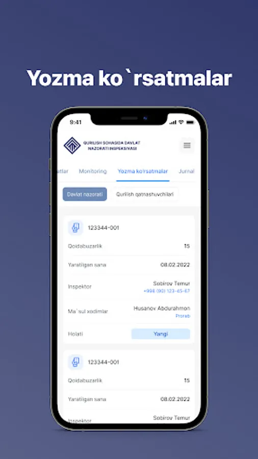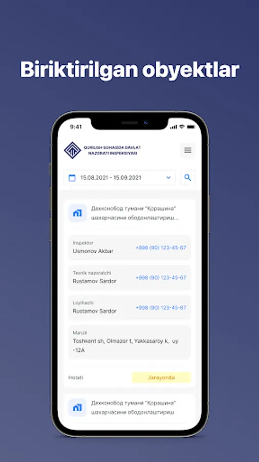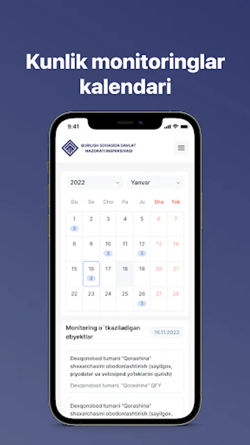 Bu platforma Qurilish sohasida Davlat Nazorati Inspeksiyasi tomonidan quruvchilarning kundalik ishlarini avtomatlashtirish maqsadida ishlab chiqildi.