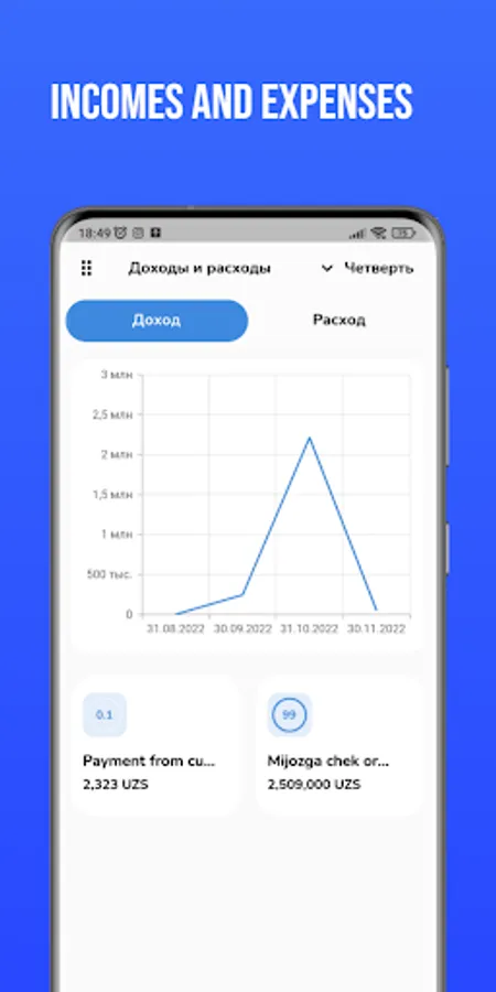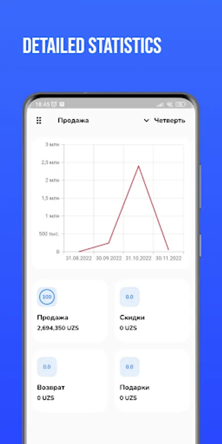 Bu to'liq takomillashgan yangi eradagi POS sistema. "Oson Sot" bu har qanday turdagi bizneslarni avtomatlashtirish uchun mo'ljallangan Web hamda Mobile dasturlar to'plami. "Oson Sot" mobile versiya bu sizga biznesingizni real vaqtda cheklar hamda kirim-chiqimlarni boshqarish imkonini beradi.