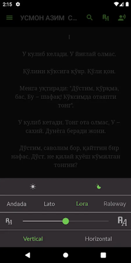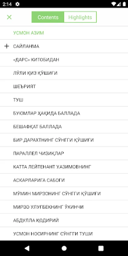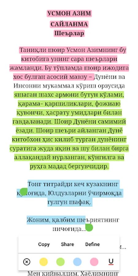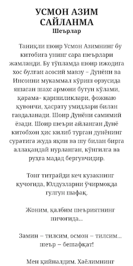 Taniqli shoir Usmon Azimning bu kitobiga uning sara she'rlari jamlandi. Bu to'plamda shoir ijodiga xos bo'lgan asosiy mavzu - Dunyoni va Insonni mukammal ko'rish orzusida yashagan shoir armoni butun ko'lami, qaramaqarshiliklari, fojiya quvonchi, hasratu umidlari bilan aks eks Shoir Dunyoni samimiy va beg'uborligini ko'rsatib berishga harakat qilgan shoirning sherlari qalbga yaqin so'zlardan iborat topgan. Shoir o'z she'rlarida hayot haqida insonlar yerdagi hayot tarzini gavdalantirgan, sizlarga maroqli mutolaba tilab qolamiz.