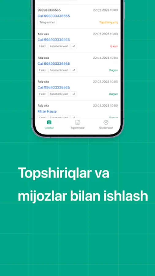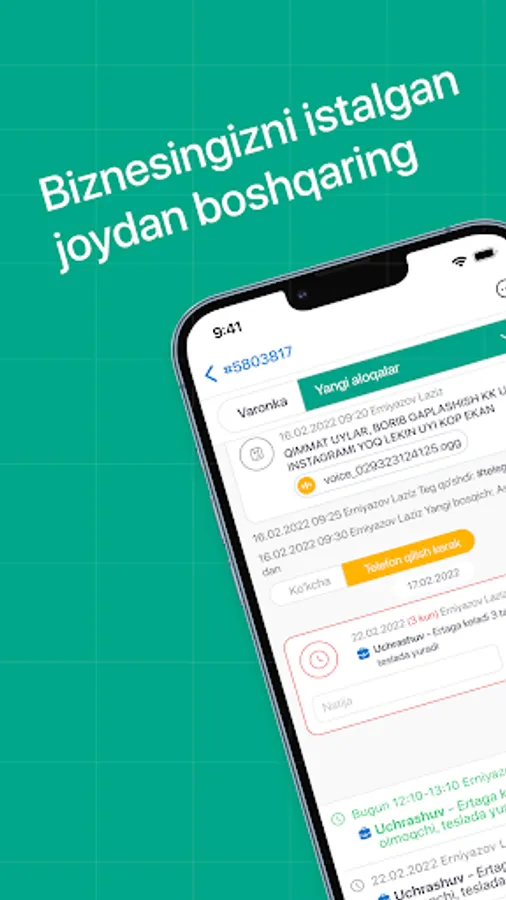 UYSOT CRM – dan foydalaning va potensial mijozlarni, savdo voronkaisini boshqaring, hamkasblar bilan o’zaro ma’lumotlar almashinuvini kuzating, topshiriq, vazifa eslatmalar yarating va biznesingizni rivojlantiring.