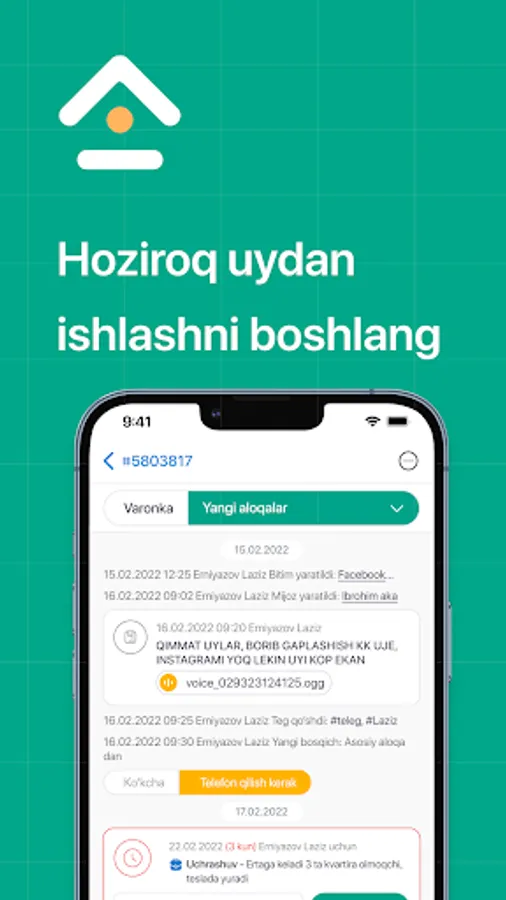 • Qo'ng'iroqlar jurnali va ovozli eslatmalarni qo'shish orqali suhbatingiz tafsilotlarini osongina yozib oling