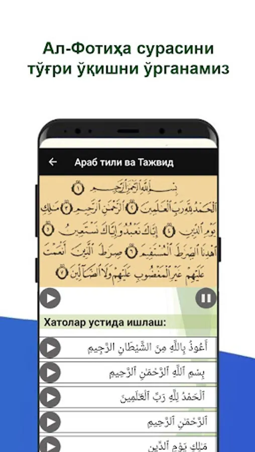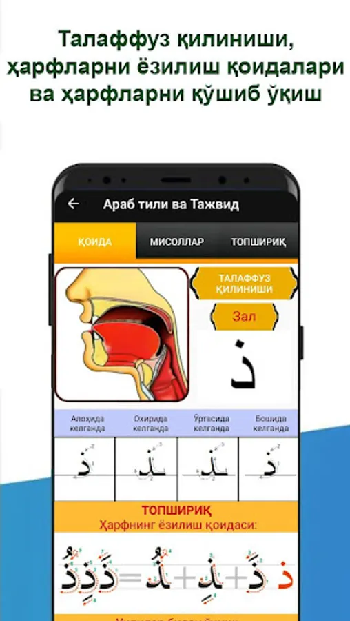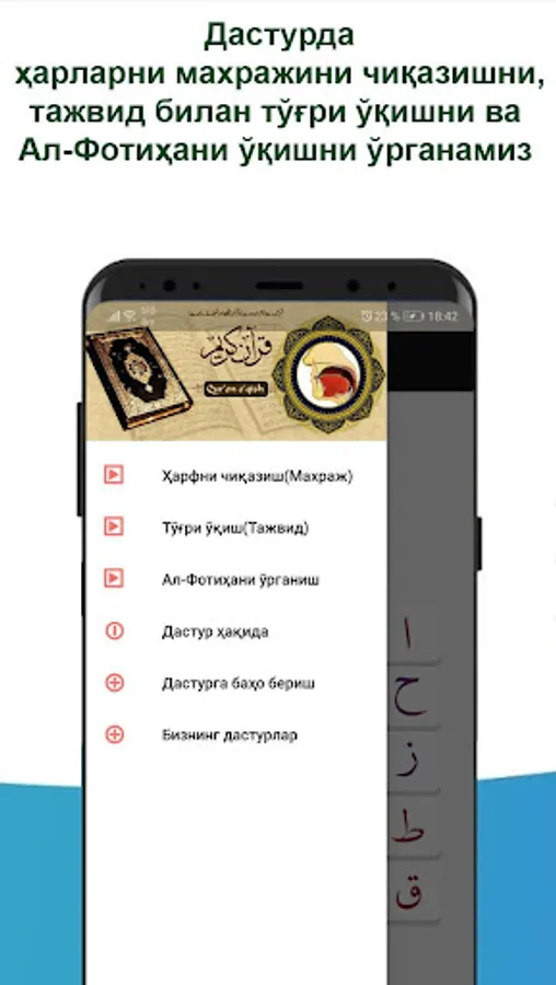 Bismillahir Rohmanir Rohiym, Qur’on o‘rganishning noyob usul jamlangan dasturni sizning e’tiboringizga taqdim etmoqdamiz. Endi Tajvid qoidalari bilan Qur’on o‘qish yanada osonroq va qiziqarliroq bo‘ldi. Dastur har taraflama universal bo‘lgani bilan, sizni to‘g‘ri talaffuz qilishingizga kafolat bera olmaydi, shu sababli biz qat’iyat bilan sizga aytamizki: dasturni o‘rganib bo‘lganingizdan so‘ng, o‘zingizga yaqin bo‘lgan masjid yoki islom jomiyalaridan birida o‘zingizni tekshirtirib oling.
