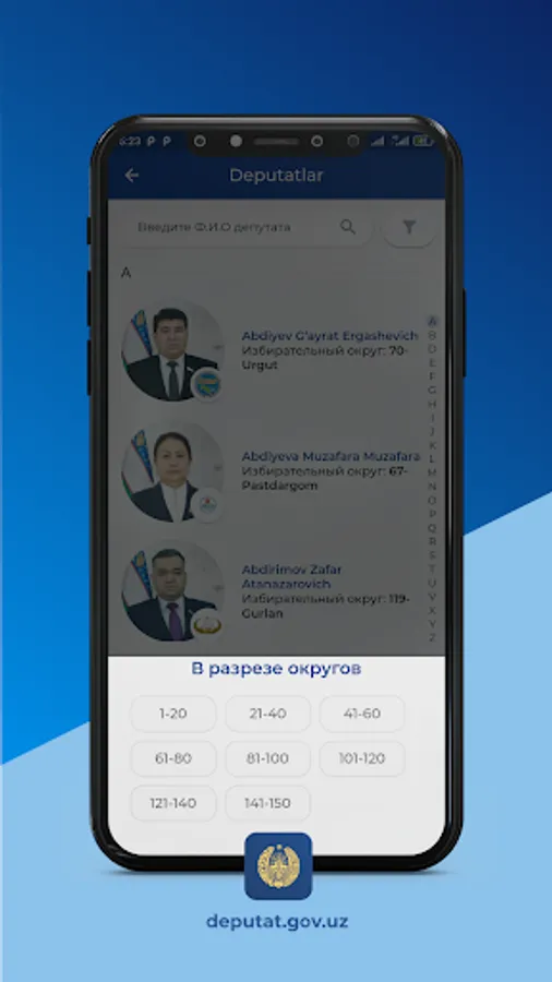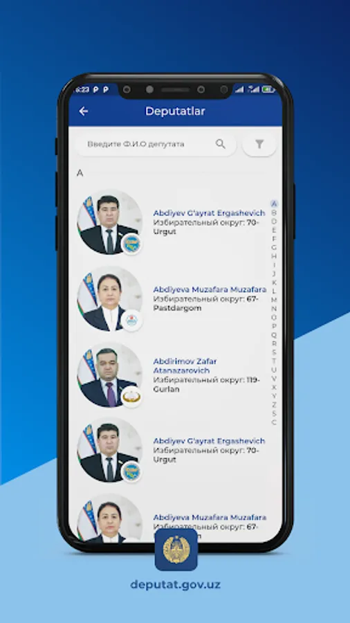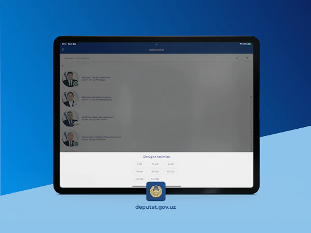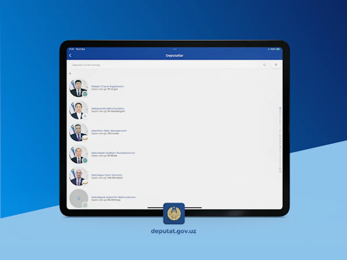 Ushbu ilova O'zbekiston Respublikasi istiqomat qilayotgan aholiga o'z deputatini topish, to'g'ridan-to'g'ri murojaat yuborish yoki uning qabuliga yozilish shuningdek deputatlar yuzasidan eng so'ngi ma'lumotlardan xabardor bo'lib turish imkonini beradi