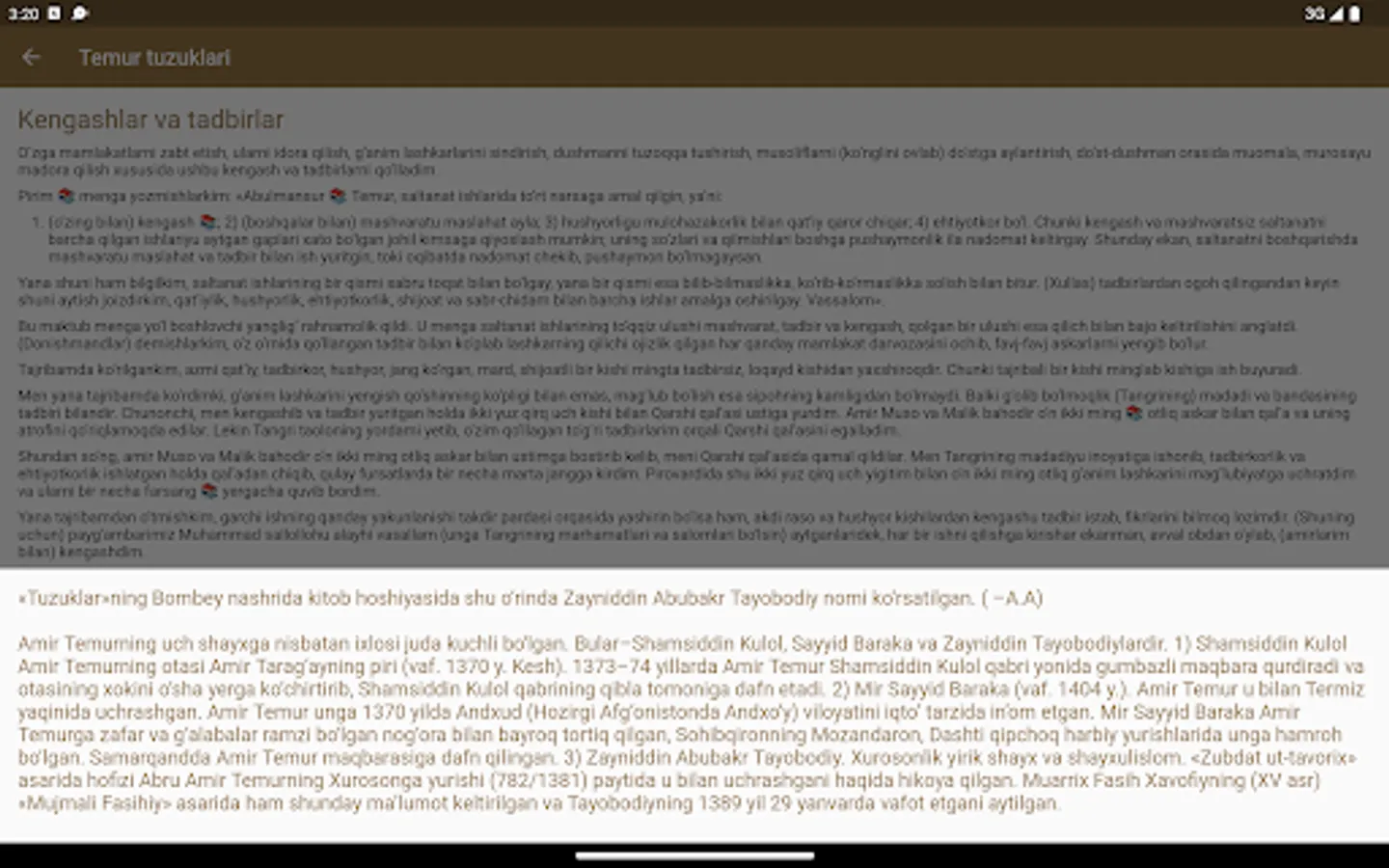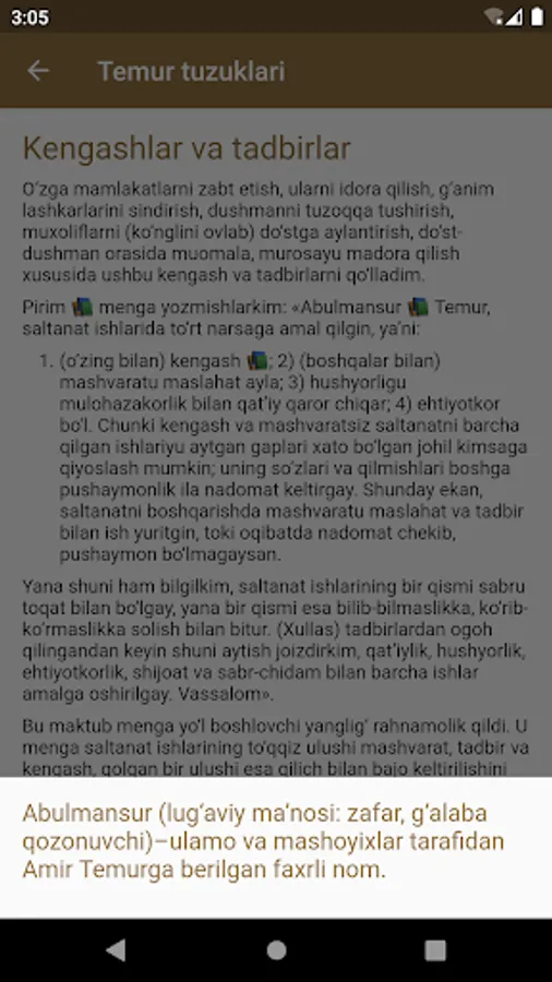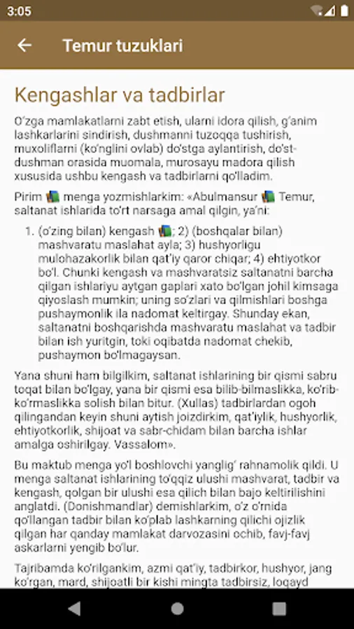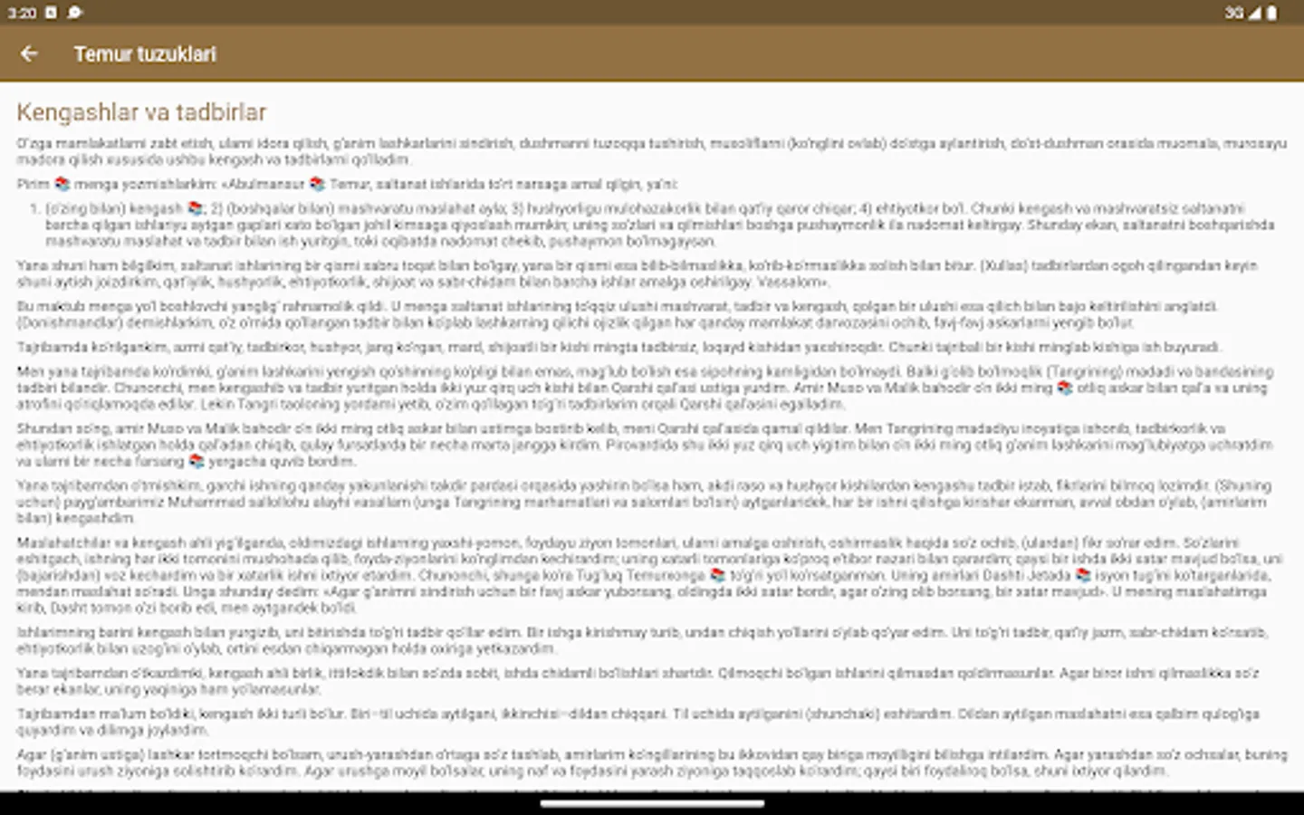 Ma'lumki, buyuk bobokalonimiz Amir Temurning "Temur tuzuklari" asari mustaqillik yillarida milliy madaniy merosimizning Nodir namunasi sifatida qayta tiklandi va bir necha bor nashr etildi. "Temur tuzuklari" asari veb-sayt shaklida ham taqdim etildi (www.temurtuzuklari.uz) ushbu loyiha UZINFOCOM markazi tomonidan O'zbekiston Respublikasi axborot texnologiyalari va kommunikatsiyalarini rivojlantirish vazirligi rahbariyati tomonidan ishlab chiqilgan bo'lib, u faqat o'zbek tilida mavjud.