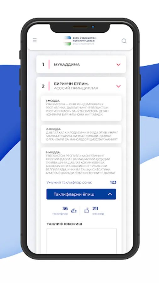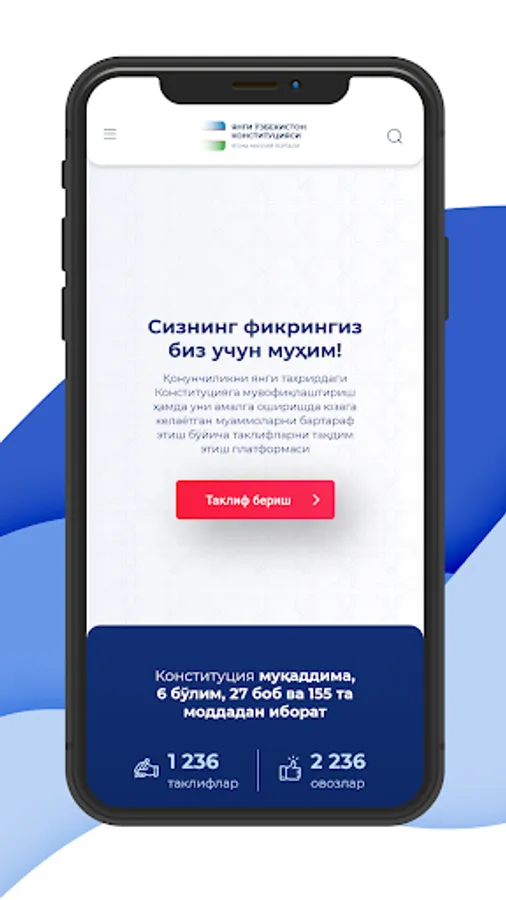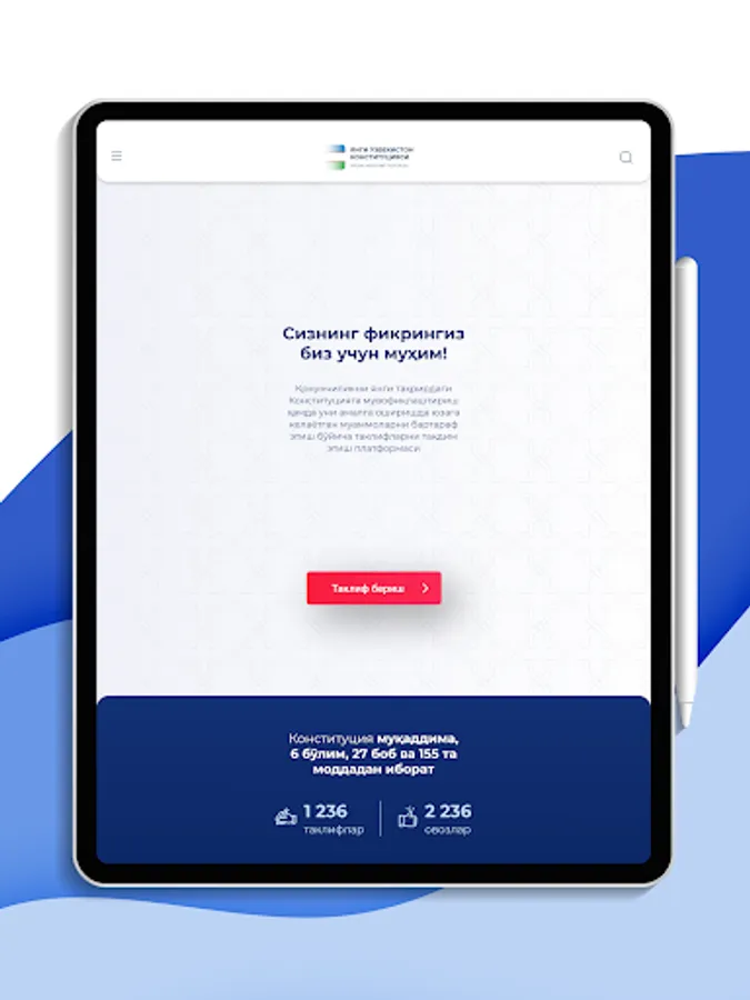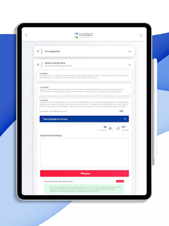 Qonunchilikni yangi tahrirdagi Konstitutsiyaga muvofiqlashtirish hamda uni amalga oshirishda yuzaga kelayotgan muammolarni bartaraf etish bo‘yicha takliflarni taqdim etish platformasi.