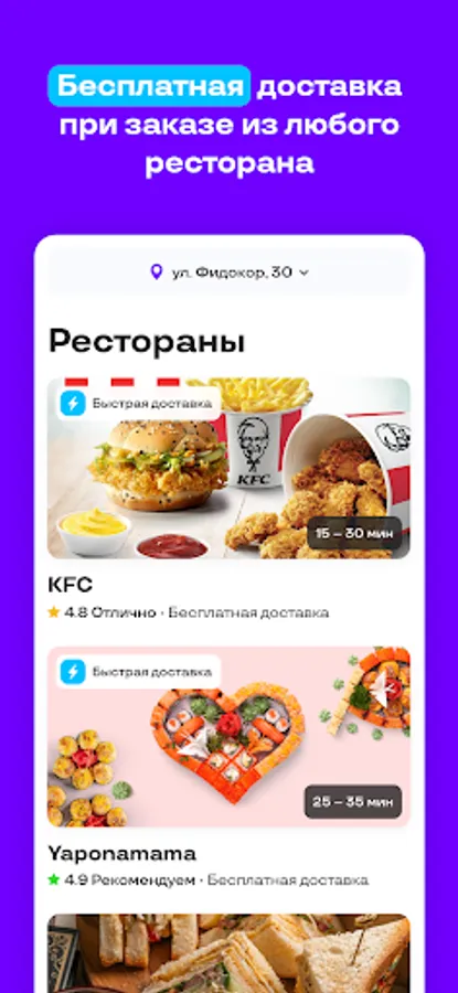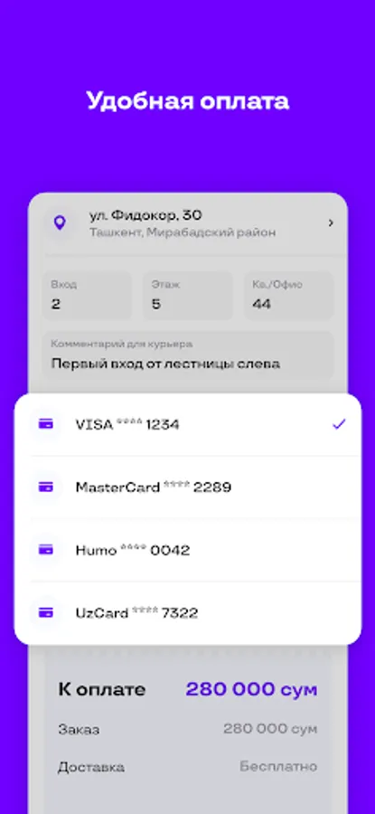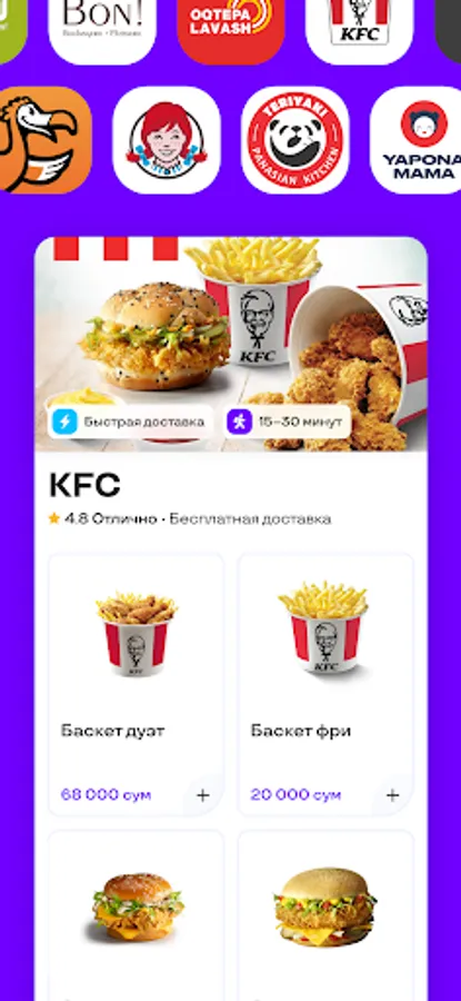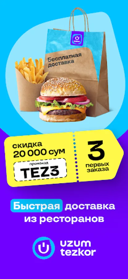 A new service for fast food delivery from cafes and restaurants from the Uzum ecosystem. Ready meals for breakfast, lunch and dinner delivered to your home and office. Do you want a delicious KFC chef burger, a Broccoli lunch or cheesecakes from the Cheese Factory? Order delivery - we will bring it quickly and free of charge directly to your door.