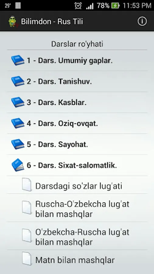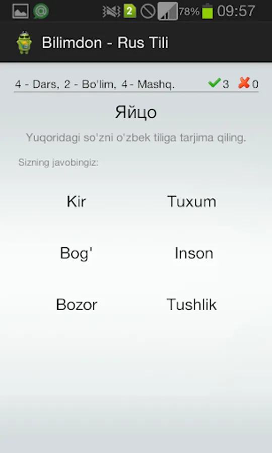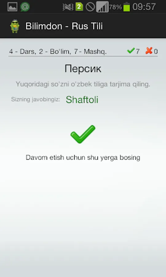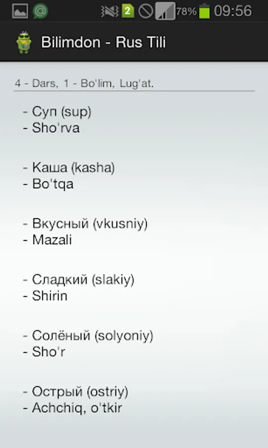 Bilimdon - Rus Tili dasturi yordamida rus tilini oson o'rganish mumkin. Dasturda har xil mavzularga aloqador mashqlar keltirilgan. Ularni ustida ishlab, tilni o'rganish ham oson ham maroqli kechadi.
