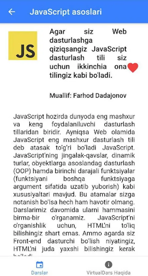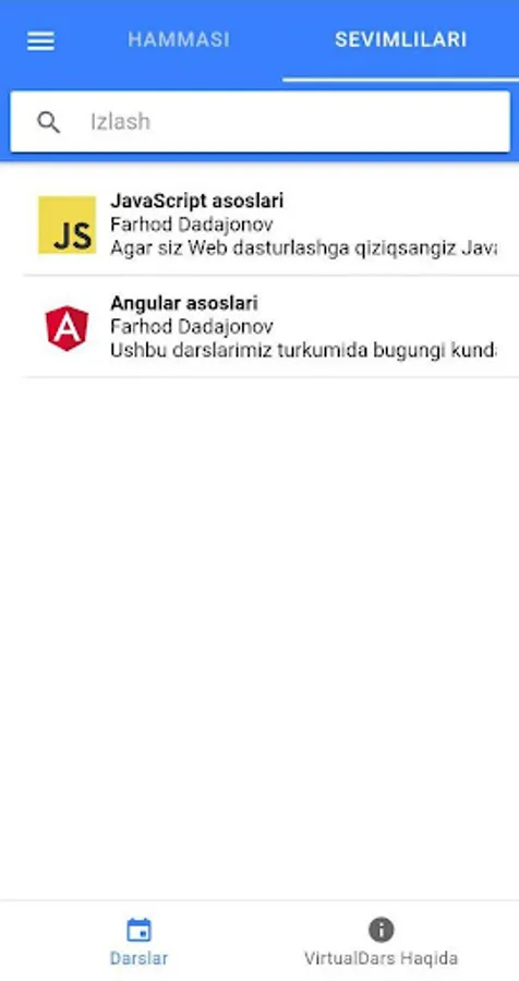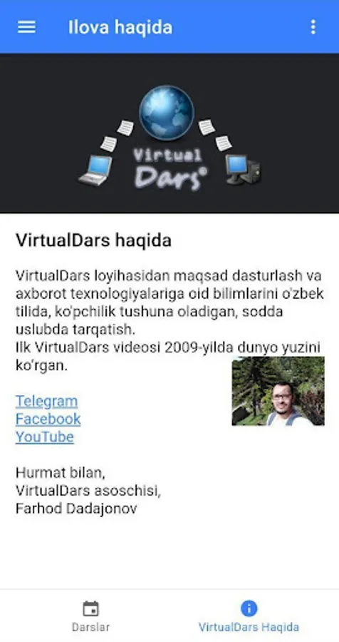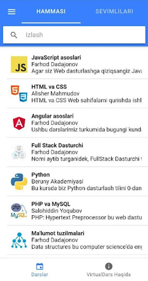 VirtualDars ilovasi axborot texnologiyalari va dasturlashga oid bo'lgan o'zbek tilidagi eng zo'r video darslarni bir joyda jamlaydi.