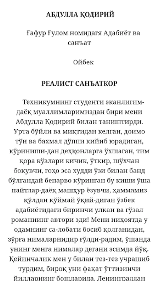 "Ustod Sadriddin Ayniy. Nomi dillarga payvand bo'lgan bu tabarruk siymo yetmish olti yil umr ko'rdi. Shundan qirq yili Buxoro amirligi davrida sarsonlik va muhtojlikda o'tdi. Ilum-ma'rifat va adabli'rifat. -diy qiyinchiliklarga haramay Buxorodagi Mir Arab, Olimjon, Hoji Zohid, Badalbek madrasalarida tahsil ko'rdi.Diniy kitob-lardan ko'ra ilm-fanga, ayniqsa, Sharh adabiyoti klassiklari Sa'davo-dsakiy, Fiyyoti klassiklird Sa'davo-dsakiy, Fiyoti Jomiy va Soib asar-lariga .... "o'qing va hikoya davomini bilib oling. Baho berishni unutmang!