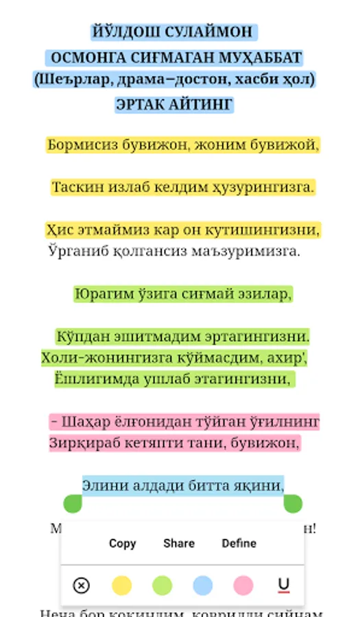 Yoldosh sulaymon buyuk kalamshunoslardan biri bulgan ushbu inson xayoti dovomida Da'vatingni eshityapman, hayot ”,“ Hamma havas qiladi ”,“ Katta yo'lga chiqquncha ”,“ Boqiy umr ”,“ Senan mening ”, qyoshimsims sig'mas dunyoga ”,“ Shahrizod bo'l bir kecha ”kabi yigirmadan ortiq she'riy va nasriy kitoblari nashr etildi.