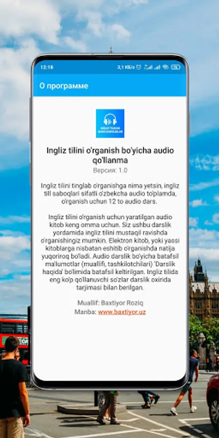 Ingliz tilini o'rganish uchun yaratilgan audio kitob keng omma uchun. Siz ushbu darslik yordamida ingliz tilini mustaqil ravishda o'rganishingiz mumkin. Elektron kitob, yoki yassi kitoblarga nisbatan eshitib o'rganishda natija yuqoriroq bo'ladi. Audio darslik bo'yicha batafsil ma'Iumotlar (muallifi, tashkilotchilari) 'Darslik haqida' bo'limida batafsil keltirilgan. Ingliz tilida eng ko'p qo'llanuvchi so'zlar darslik oxirida tarjimasi bilan berilgan.