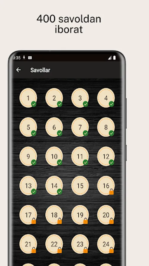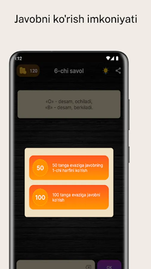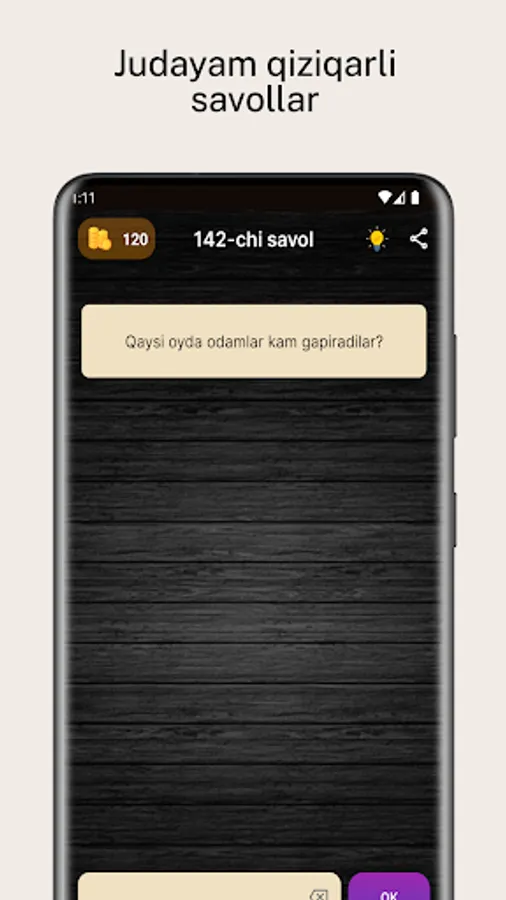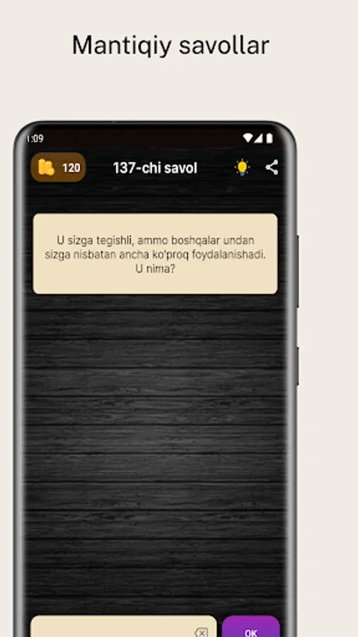 O'zingizni mantiqiy o'ylash bilimlaringizni sinab ko'ring! Bu dastur sizga 400-ta o'zbekcha mantiqiy savollarni taqdim etadi. Har bir savolni to'g'ri javob bilan hal qiling va yangi savollarni oching.